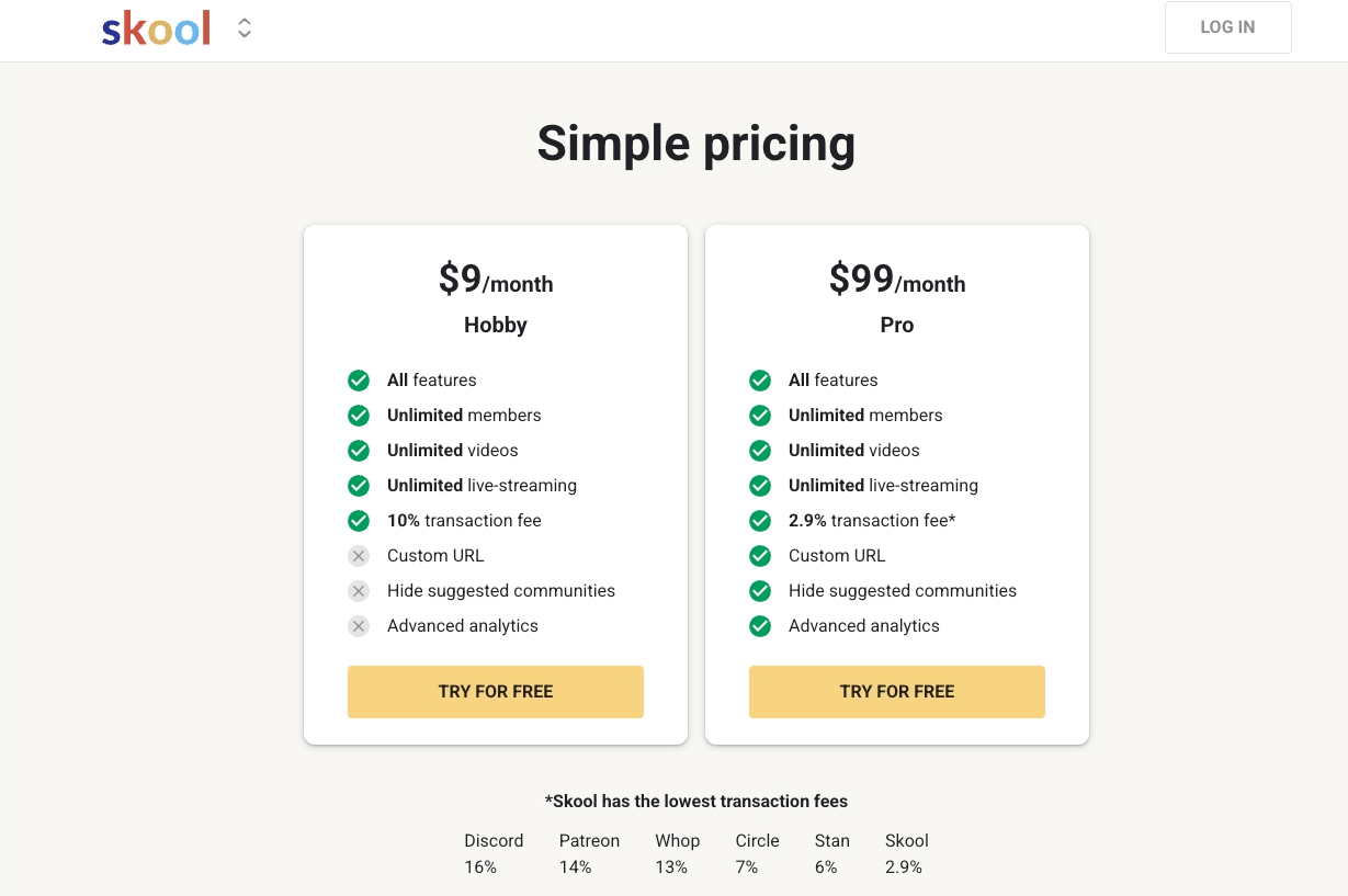 For years, Skool only had one price: $99/month. While that was great for simplicity, it was a high barrier for new creators.